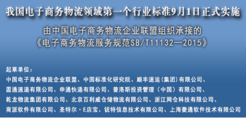 《电子商务物流服务规范》(SB/T11132—2015)是由商务部流通发展司牵头,中国电子商务协会、中国电子商务物流企业联盟组织承接,顺丰速运集团与中国标准化研究院主笔起草,在全国服务业标准化技术委员会、中国标准化研究院、中国电子商务协会等相关单位的支持下,组织电子商务物流行业的相关专家及企业家和消费者代表,以及中国电子商务物流企业联盟、中国标准化研究院、顺丰速运(集团)有限公司、圆通速递有限公司、申通快递有限公司、普洛斯投资管理(中国)有限公司、乾龙物流集团有限公司、北京百利威仓储物流有限公司、浙江网仓科技有限公司、商派软件有限公司、圣特尔·E店宝、锐特信息技术有限公司、上海菱通软件技术有限公司等企业共同制定。>>>点击阅读详情