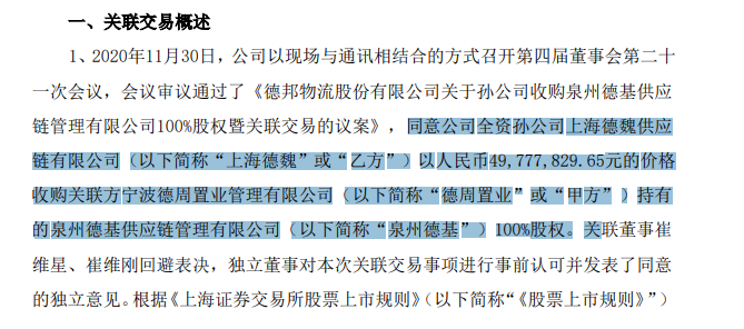 12月1日,德邦快递发布公告称,同意公司全资孙公司上海德魏供应链有限公司以人民币49,777,829.65元的价格收购关联方宁波德周置业管理有限公司持有的泉州德基供应链管理有限公司100%股权。德邦快递表示,本次关联交易系为了优化公司的整体运营及资源整合而进行,有助于公司业务协同发展。