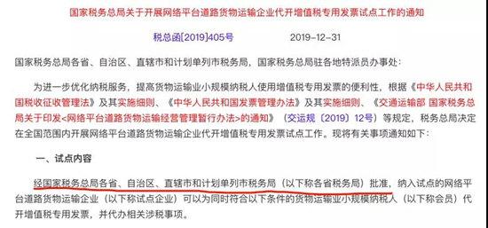 这里就要提到一个文件,国税总函[2019]405号文,提到网络货运平台获取代开增值税发票资质需要“经国家税务总局各省、自治区、直辖市和计划单列市税务局批准”。